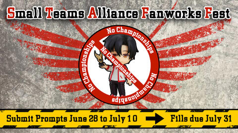 How does this event work?Participants submit prompts during the prompting period, create an eligible fan work, and post it during the fill period. You may choose one or more prompts to fill, but filling a prompt isn't required. We accept all small teams content!Pretty simple, huh? You don’t even have to sign up. The STAFF event is designed to be a low-stress, easy participation event. We just want to spread the small teams love!